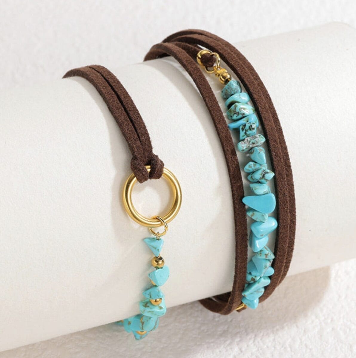 Bohemian Turquoise Beaded Bracelet with Leather Cord & Gold Tone Chain