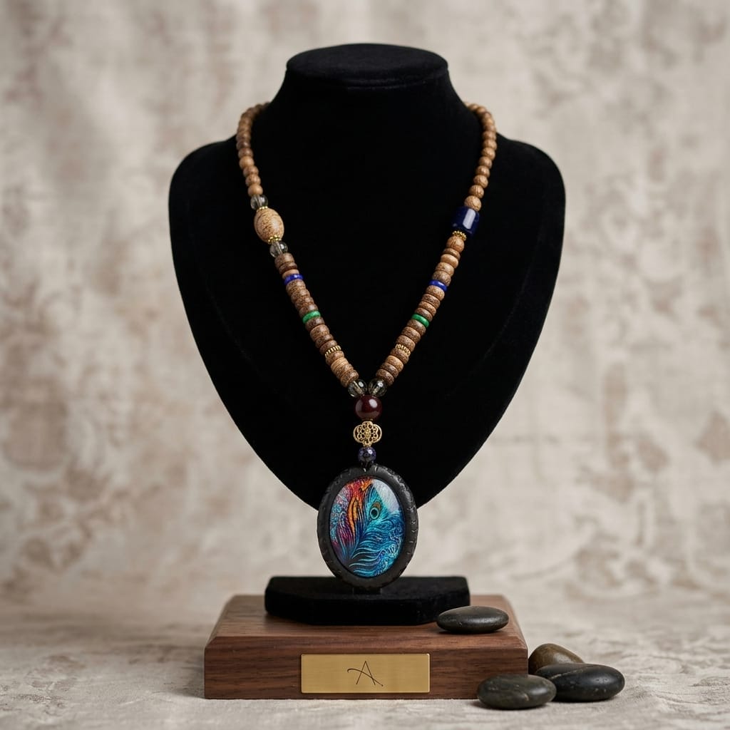 Handcrafted Peacock Mala Necklace Wooden Beads Pendant Spiritual Ethnic Statement Jewelry
