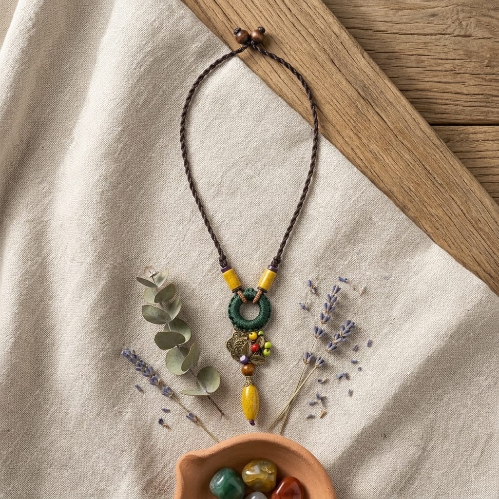 Handcrafted Wooden Mala Necklace with Carved Stone Pendant Boho Ethnic Long Necklace
