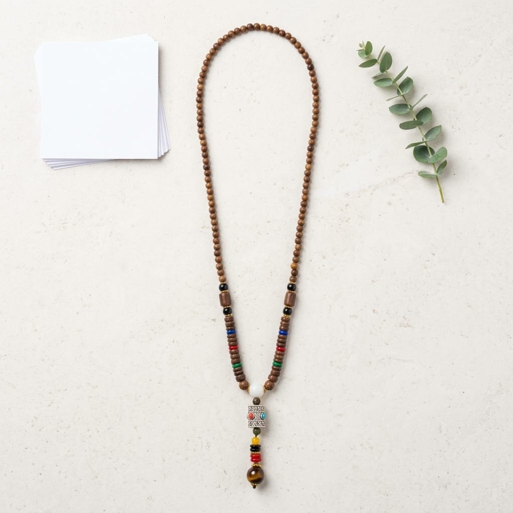 Handcrafted Wooden Mala Necklace with Multicolor Beads Pendant Long Spiritual Boho Necklace