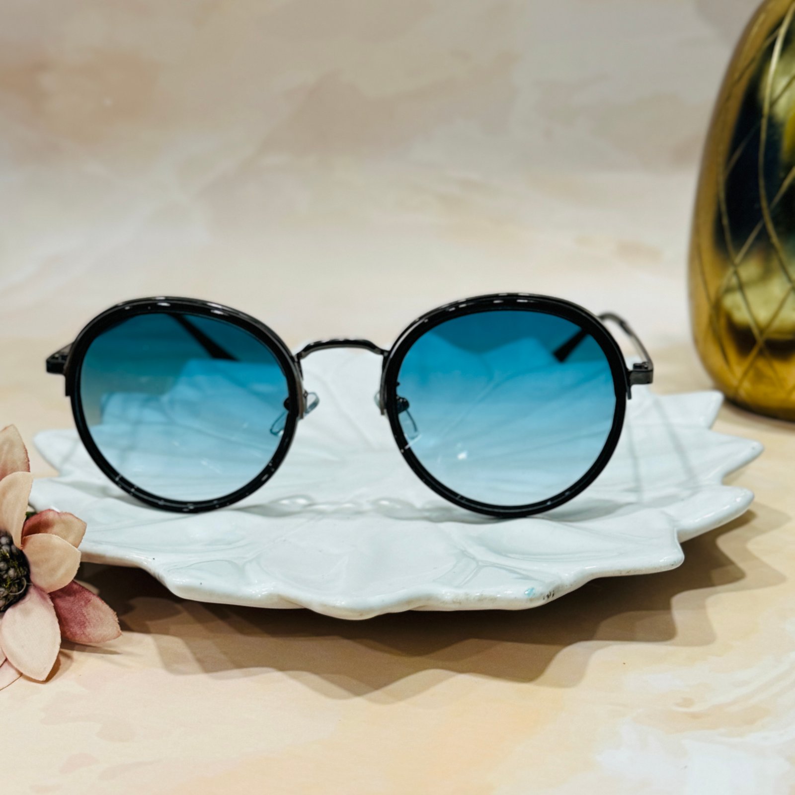 Semi-round, blue lens, light weight, luxury sunglasses