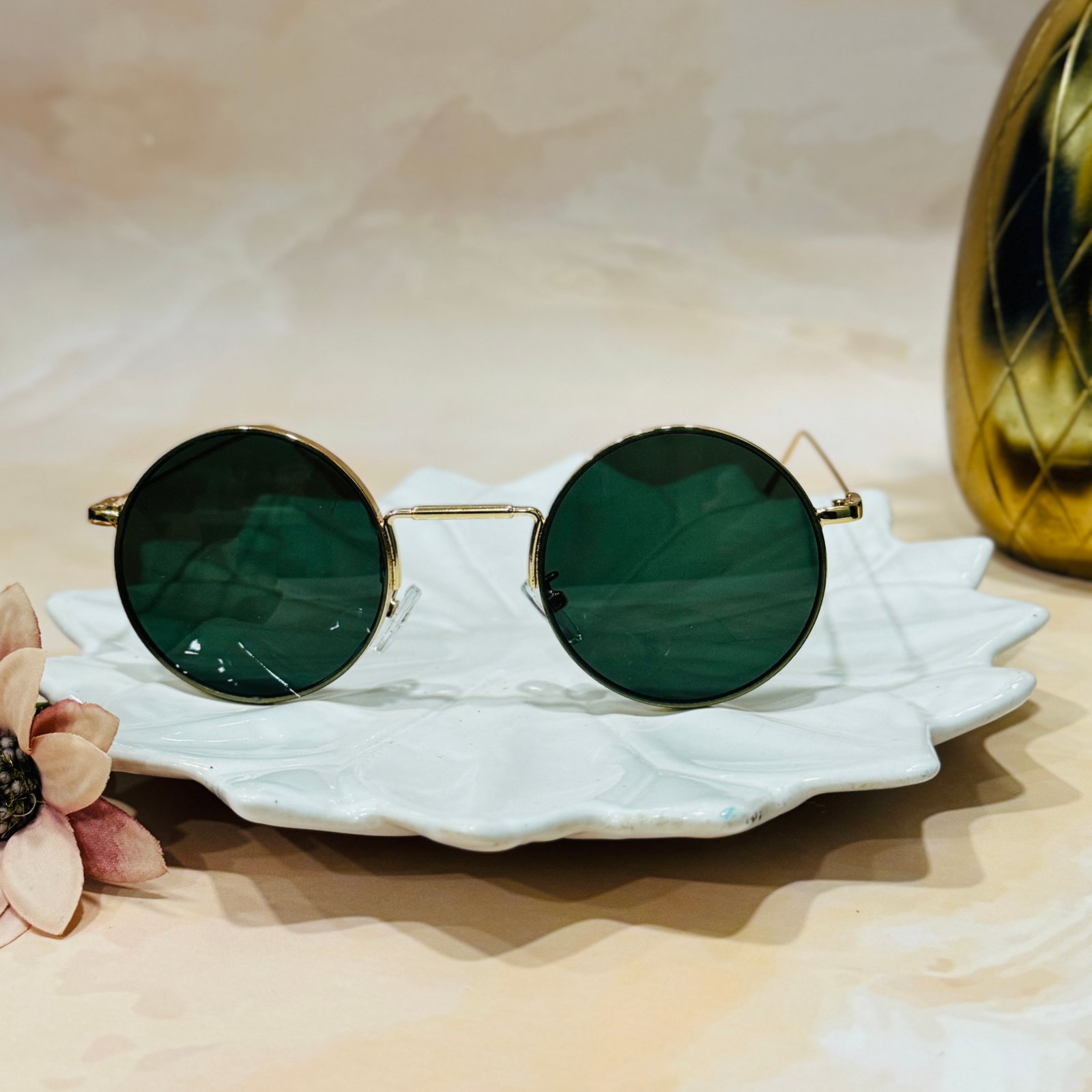 Round, golden, green lens, luxury sunglasses